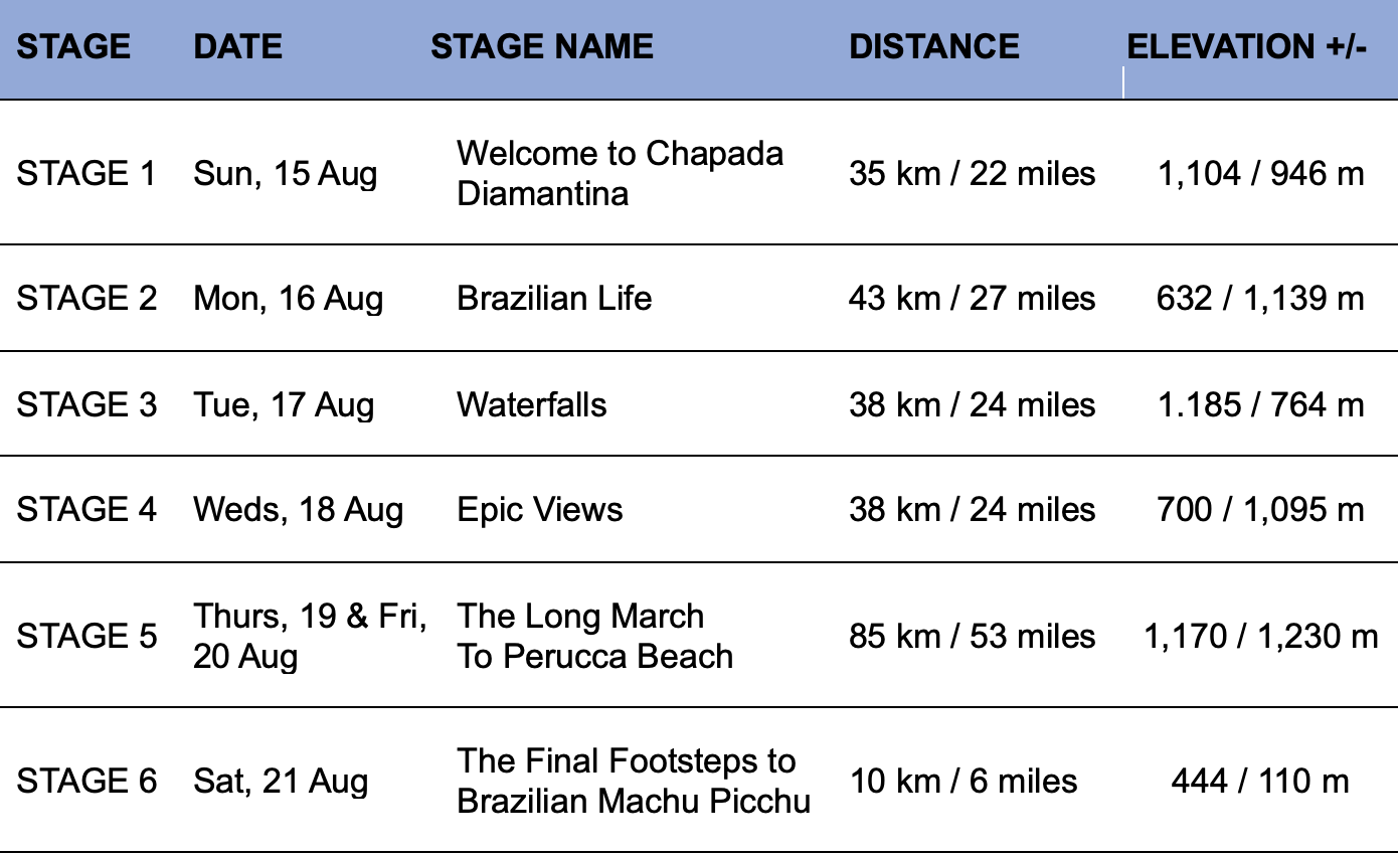 Get ready for an immersion into Brazil through landscapes, history, and rhythm in the natural paradise of Chapada Diamantina over the 250km, 6-Stage course. You can expect towering plateaus, hidden canyons, spectacular waterfalls, mineral-rich rivers, dirt roads through small villages, all connected by trails and dust roads. More detail on the course can be seen below including a map, Stage distances, the elevation profile, details about the terrain, checkpoints, cut-off times, and The Long March which is Stage 5. Final course notes will be given to each person in Brazil at the competitor check-in before the race.