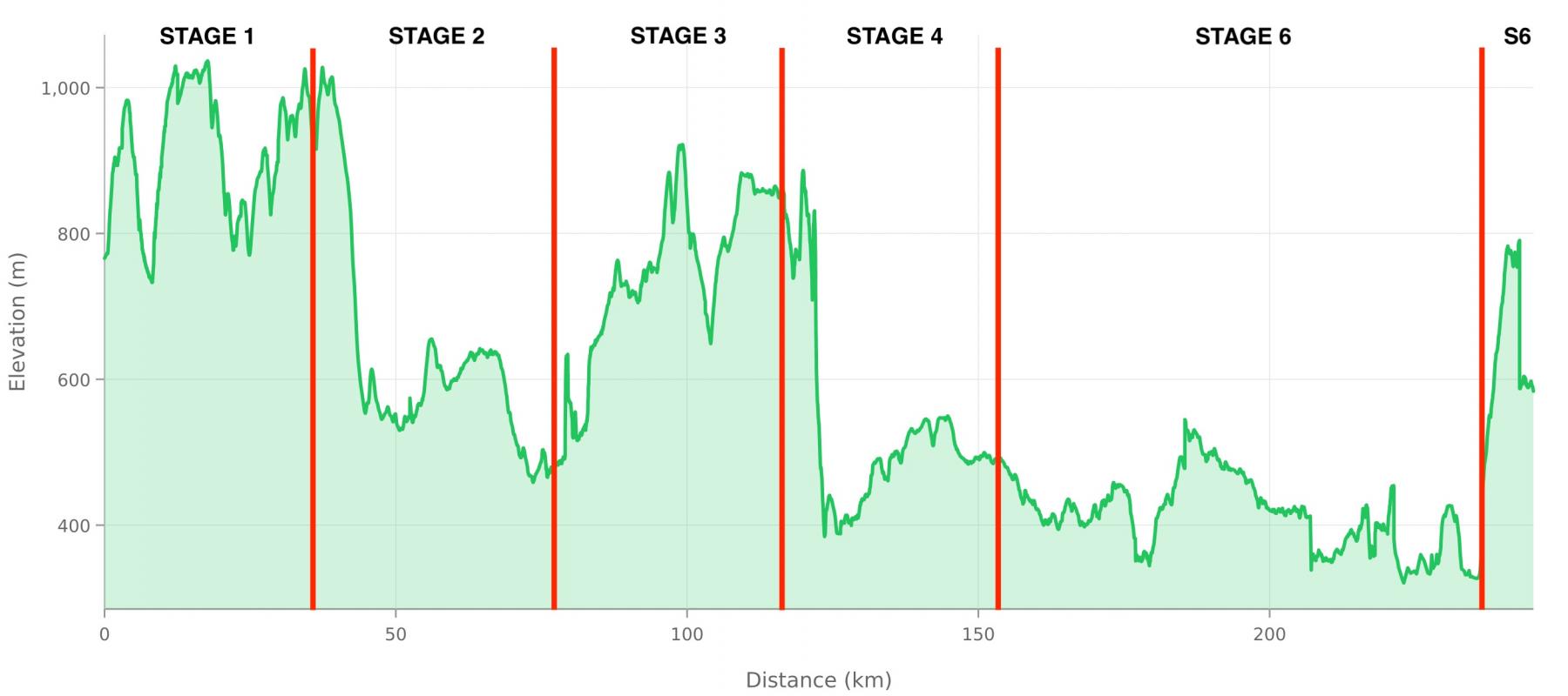 The highest point of the course is 1,037 meters / 3,402 feet – this is on Stage 1.