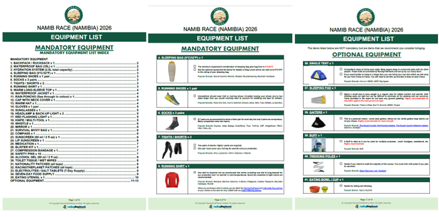 Do not be alarmed at the length of the Namib Race Equipment List (13 pages) - all 35 mandatory items fit on one page (see page 1) but we have added more information to help you understand each item and have included photos and examples of recommended makes and models. Make sure you read through the descriptions of the items to fully understand each requirement.