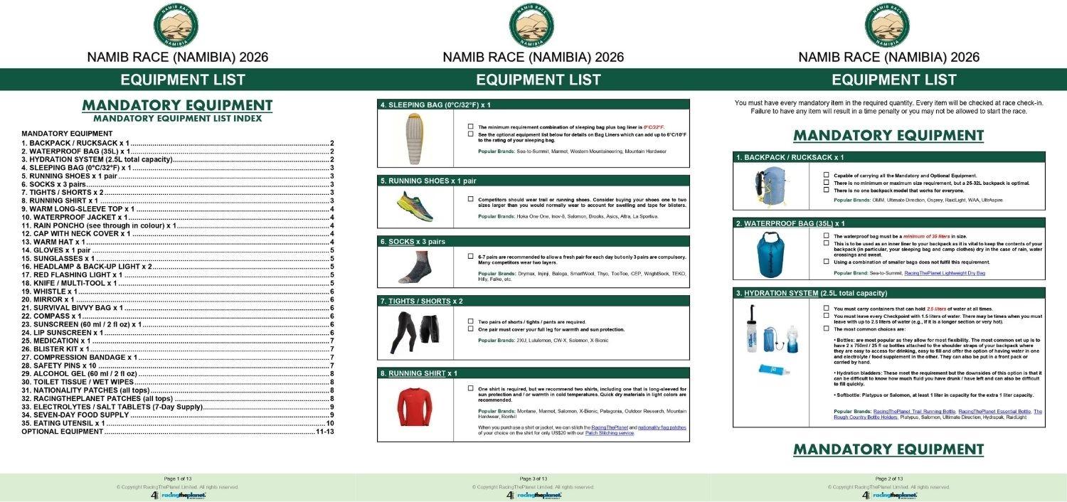 Do not be alarmed at the length of the Namib Race Equipment List (13 pages) - all 35 mandatory items fit on one page (see page 1) but we have added more information to help you understand each item and have included photos and examples of recommended makes and models. Make sure you read through the descriptions of the items to fully understand each requirement.