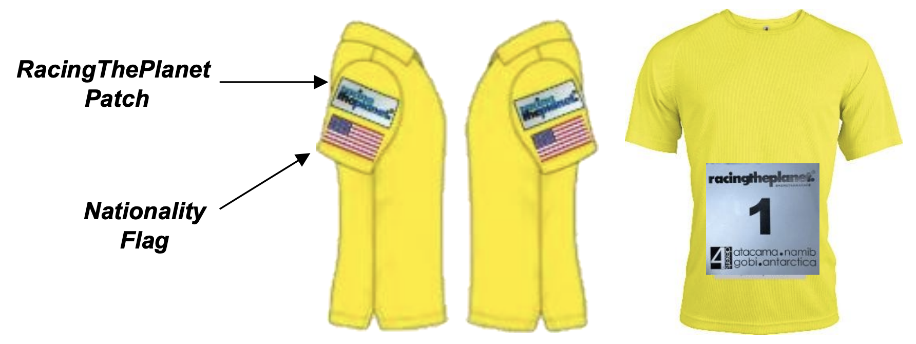 All tops you bring must have RacingThePlanet and nationality patches attached as per the Patch Placement document.