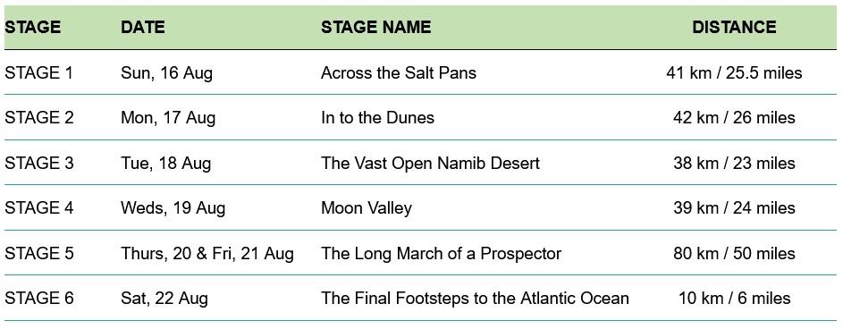 The distance for each of the stages of the Namib Race can be seen below. NOTE that the Long March is on Stage 5 and will take place over two days. The actual planned distances for each stage will not be finalized until closer to the race but will be close to the distances stated below.