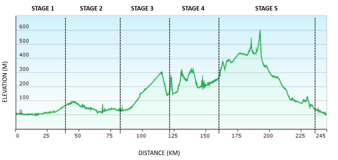 Much of the race takes place at or close to see level and the highest point is at 600 meters / 2,000 feet.